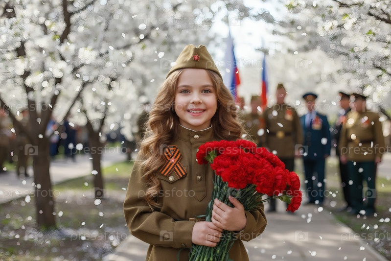 Концепция праздника 9 мая.Портрет девушки в военной форме с ленточкой Святого Георгия и красными гвоздиками, отмечающей День Победы в 1941-1945 годах