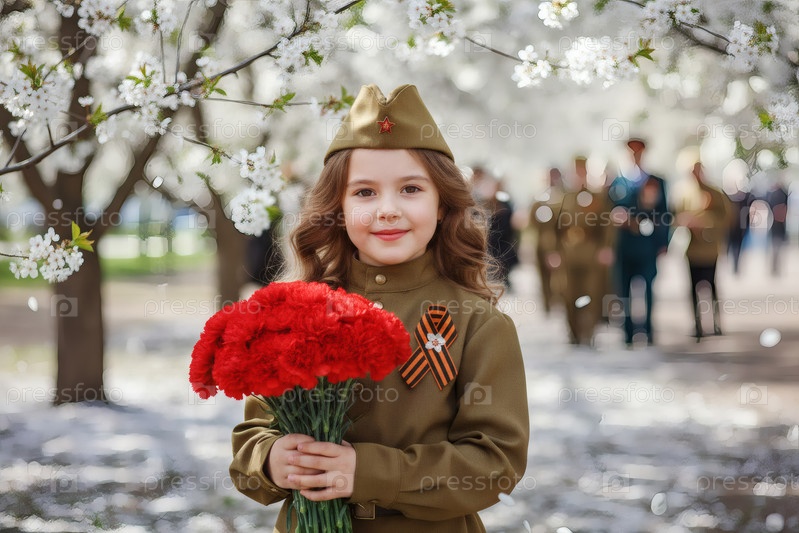 Концепция праздника 9 мая.Портрет девушки в военной форме с ленточкой Святого Георгия и красными гвоздиками, отмечающей День Победы в 1941-1945 годах