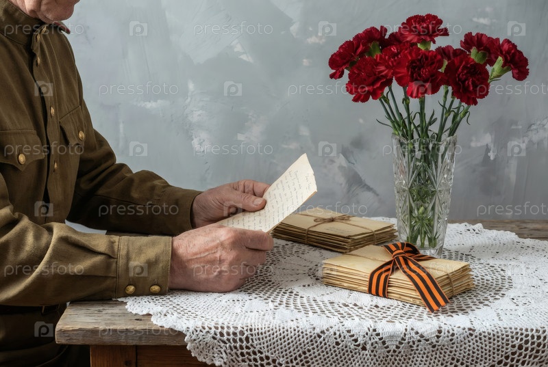 Концепция праздника 9 мая. пожилой солдат читает старые военные письма, сидя за столом. на сером фоне есть ленточка Святого Георгия, буквы, военная шляпа и красные гвоздики