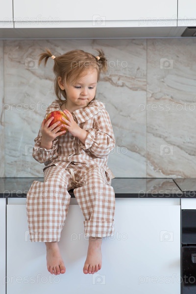 2-летняя девочка в пижаме сидит на столешнице кухни, ест яблоко. детское питание. кормление ребенка. здоровая еда. свежие овощи и фрукты