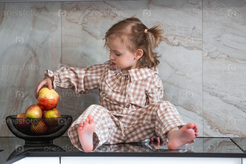 2-летняя девочка в пижаме сидит на столешнице кухни, ест яблоко. детское питание. кормление ребенка. здоровая еда. свежие овощи и фрукты