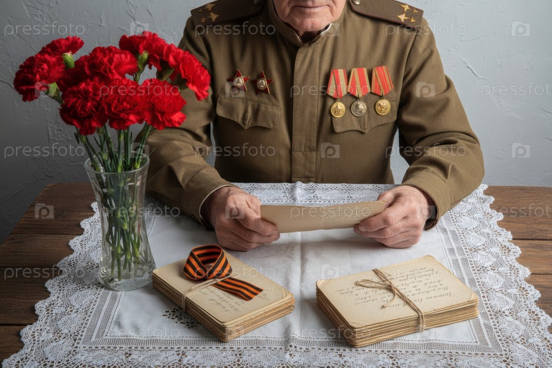 Концепция праздника 9 мая. пожилой солдат читает старые военные письма, сидя за столом. на сером фоне есть ленточка Святого Георгия, буквы, военная шляпа и красные гвоздики