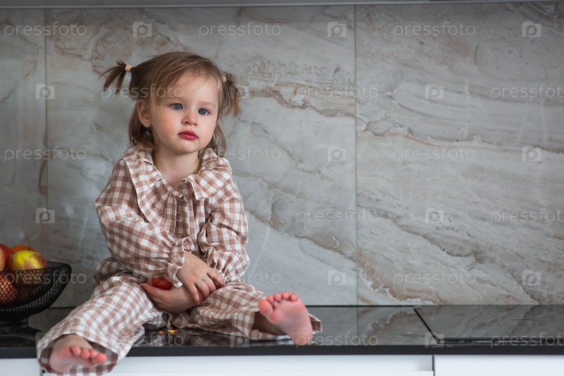 2-летняя девочка в пижаме сидит на столешнице кухни, ест яблоко. детское питание. кормление ребенка. здоровая еда. свежие овощи и фрукты