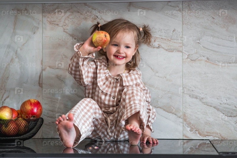 2-летняя девочка в пижаме сидит на столешнице кухни, ест яблоко. детское питание. кормление ребенка. здоровая еда. свежие овощи и фрукты