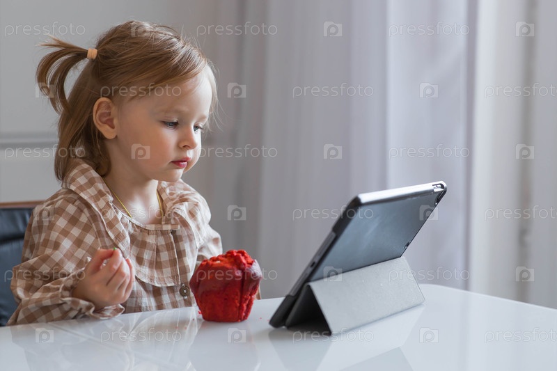 Милая 2-летняя девочка сидит за столом с планшетом. Ребенок играет с телефоном. Опасность гаджетов для детей. Защитите своего ребенка от смартфонов. Дети и гаджеты
