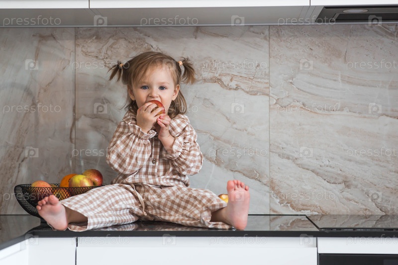 2-летняя девочка в пижаме сидит на столешнице кухни, ест яблоко. детское питание. кормление ребенка. здоровая еда. свежие овощи и фрукты