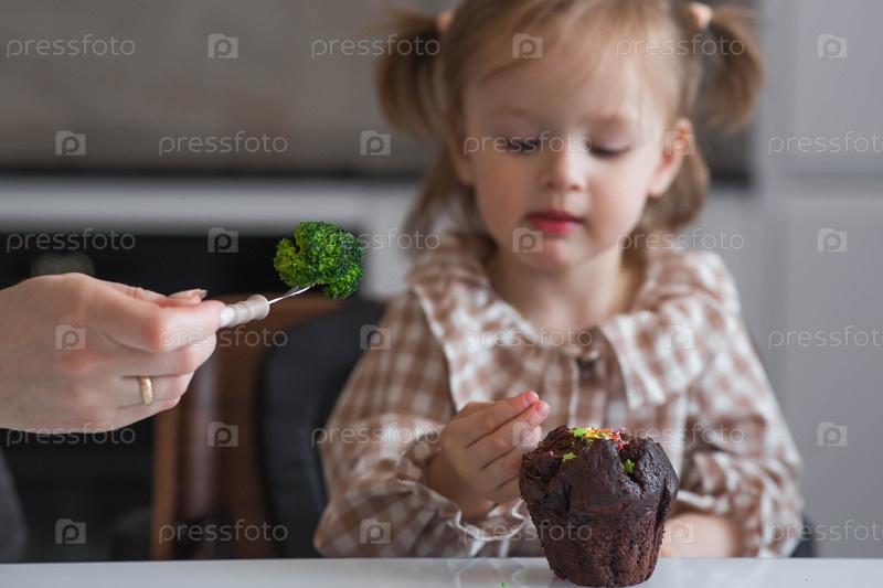 Мать кормит маленькую девочку брокколи, и на столе лежит кекс. Ребенок отказывается есть овощи. Детская еда. Здоровая и нездоровая пища