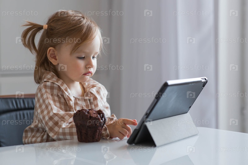 Милая 2-летняя девочка сидит за столом с планшетом. Ребенок играет с телефоном. Опасность гаджетов для детей. Защитите своего ребенка от смартфонов. Дети и гаджеты