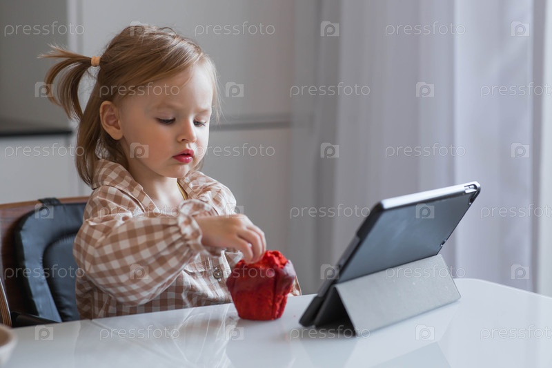 Милая 2-летняя девочка сидит за столом, ест кексы и играет с планшетом.Опасности гаджетов для детей.Защитите своего ребенка от смартфонов.Дети и гаджеты