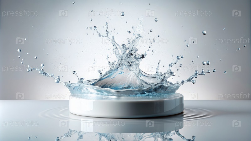 Вода брызгает на белый подиум против светло-серого фона