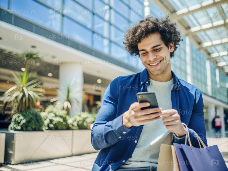 Улыбающийся мужчина пользуется телефоном, держа сумки для покупок в современном торговом центре