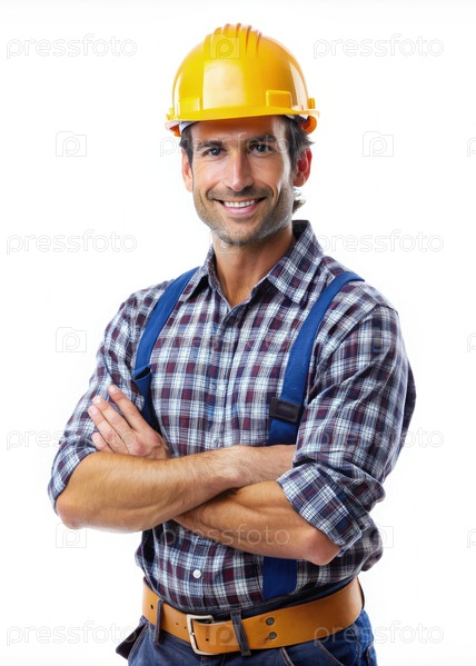 Улыбающийся строительный работник с перекрещенными руками и желтой жесткой шляпой. генеративный ИИ