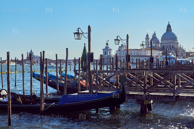 Живописный участок Гранд-канала в Венеции. На переднем плане — несколько гондол, пришвартованных к деревянным столбам у причала