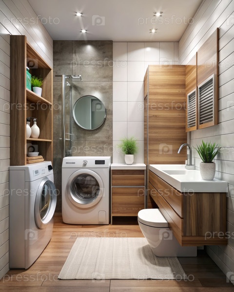 Современная ванная комната с стиральной машиной и деревянными шкафами