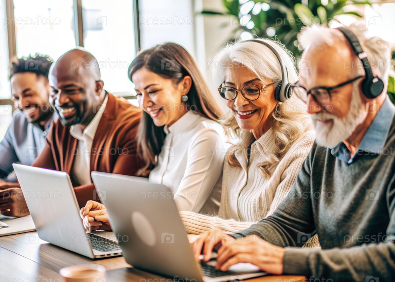 Разнообразная группа взрослых, занимающихся онлайн-обучением в современном офисе