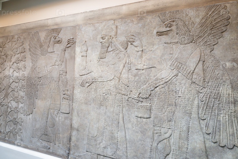 Исторический ассирийский каменный артефакт, выставленный в Британском музее, Лондон, Великобритания