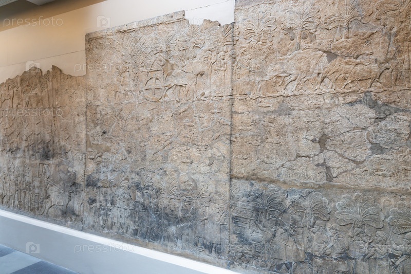 Древний ассирийский каменный рельеф в Британском музее, Лондон, Великобритания
