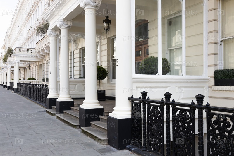 Жилое жилье в классическом британском стиле в богатом районе, с грандиозными столбовыми входами, черными заборами и чистыми асфальтированными тротуарами