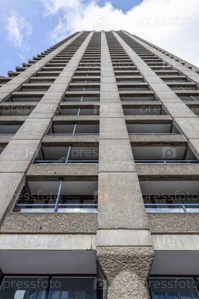 Смотря прямо вверх по бокам массивной бетонной многоквартирной башни, подчеркивая симметричную геометрию и структурный дизайн современного городского жилья