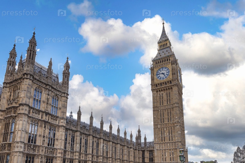 Биг-Бен и здания парламента возвышаются над Лондоном с ярко-синим небом и мягкими облаками