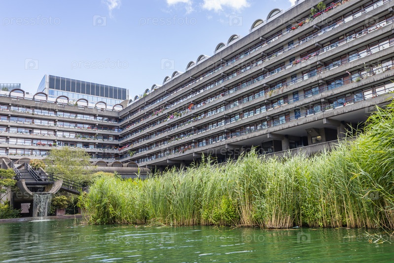 Знаменитая бруталистская архитектура поместья Барбикан в центре Лондона с бетонными жилыми башнями и безмятежными водными садами