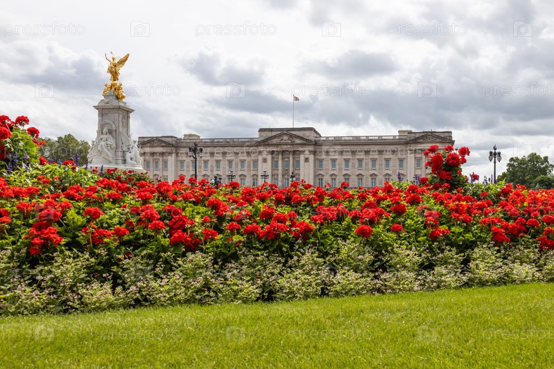 Великолепный фасад Букингемского дворца величественно стоит за яркими красными гераниями и пышной зеленой травой в самом сердце Лондона