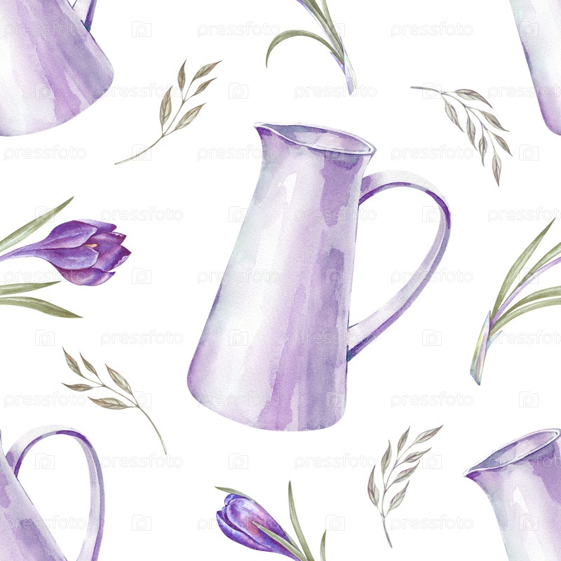 Бесшовный весенний рисунок с белым кувшином, фиолетовыми крокусами и зелеными листьями. Иллюстрация акварели на изолированном фоне. Реалистичный сезонный фон для домашнего декора на тему весны, Пасхи, Дня матери и 8 марта