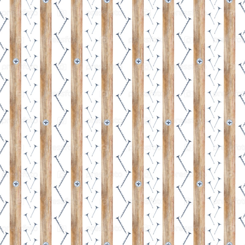 Бесшовный рисунок деревянных лестниц, гвоздей и винтов на изолированном фоне. Иллюстрация акварели с рабочими инструментами для ремонта дома. Вертикальный фон для упаковки, проектирования ремонтных мастерских и сервисных объектов