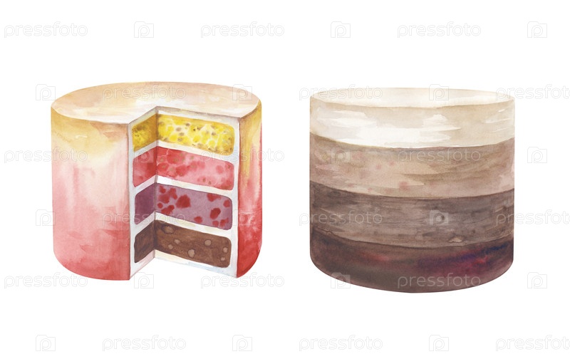 Набор с двумя основаниями для торта, нарисованный вручную. Иллюстрация акварели выделена на изолированном фоне. Шаблон губчатого торта для украшения различными аксессуарами по вашему усмотрению. Реалистичный клипарт для записей, кулинарных блогов и книг