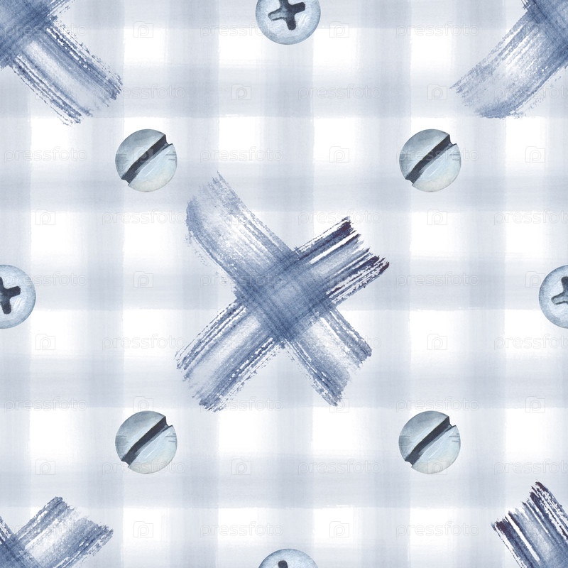 Бесшовный рисунок с крестообразными пятнами краски и самонажимающимися винтовыми головками на изолированном фоне. Иллюстрация акварели на квадратном фоне. Фон с рабочими инструментами для ремонта дома
