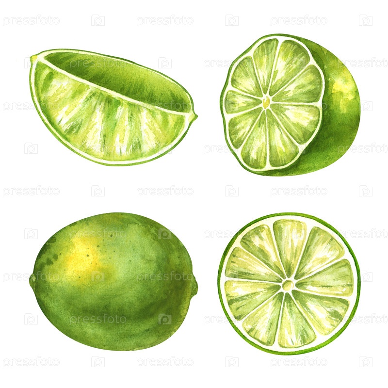 Набор с акварелью сочных известняков на изолированном фоне. Ботаническая иллюстрация с целым фруктом, половиной, четвертью и разрезанным кругом. Реалистичный клипарт экзотических зеленых плодов для продуктовых и косметических линий