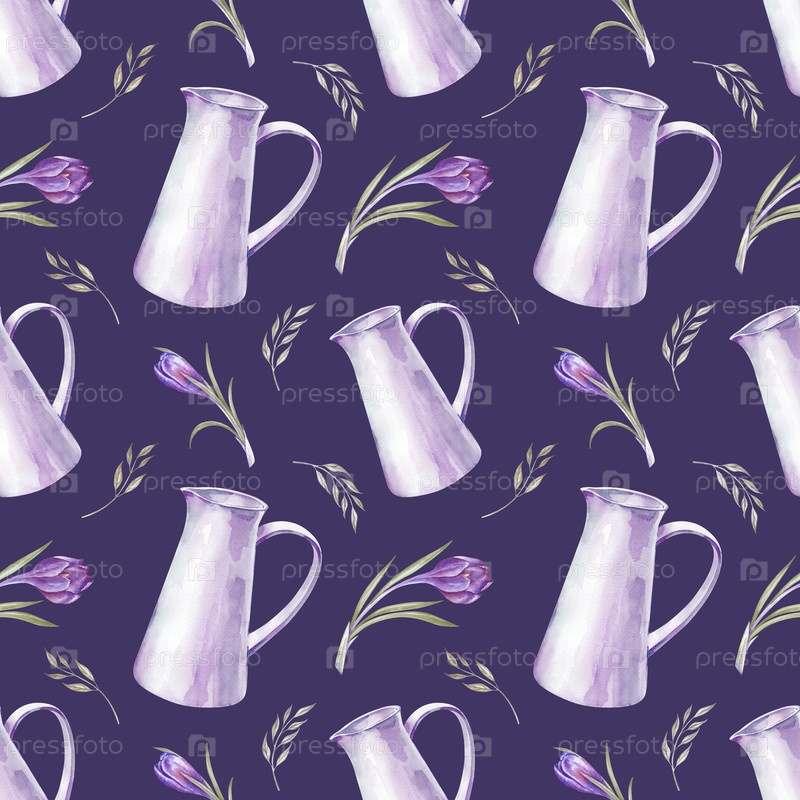 Бесшовный весенний рисунок с белым кувшином, фиолетовыми крокусами и зелеными листьями. Иллюстрация акварели на темно-фиолетовом фоне. Реалистичный сезонный фон для дизайна весенней тематики к Пасхе, Дню матери и 8 марта
