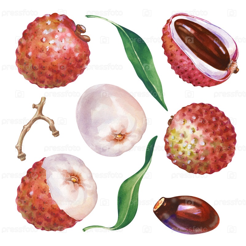 Набор с акварельной краской фруктов личи на изолированном фоне. ботаническая иллюстрация со всем личи в коже, мякоти, ветвицы, зеленых листьев, камня и половины плода. реалистичный клипарт для коктейлей и десертов