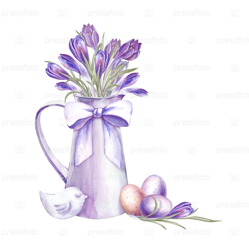 Весенняя композиция с фиолетовыми крокусами в кружке с белым луком, окрашенными яйцами и статуэткой белой птицы.Акварельная иллюстрация пасхального домашнего декора для открыток, приглашений, весенних тем.Изолированный рисунок