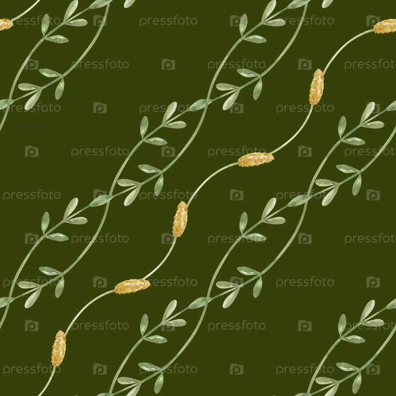 Диагональный бесшовный рисунок с переплетенными тонкими зелеными ветвями и колючками травы на темно-зеленом фоне. Ботанический орнамент с листьями. Минималистский бесшовный фон для упаковки бумаги, обоев, текстиля, посуды