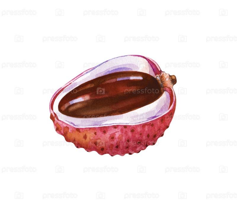 Половина сочного фрукта личи с коричневым блестящим камнем. акварельная иллюстрация сладкого экзотического плода с мякотью и кожурой на изолированном фоне. реалистичный клипарт для меню, этикетки и здоровой пищи