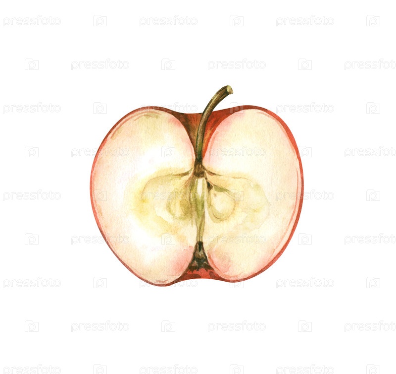 Половина спелого красного яблока на изолированном фоне.Акварельная иллюстрация сочного фрукта.Реалистичный ботанический клипарт для меню, варенья, детского питания