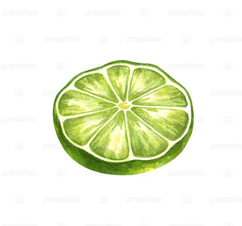 Акварельная иллюстрация круглого сочного куска лайма. Ярко-зеленые фрагменты цитрусовых с реалистичной текстурой. Реалистичный клипарт подходит для украшения летних напитков, меню коктейлей, упаковки органических продуктов питания и декорации кухни