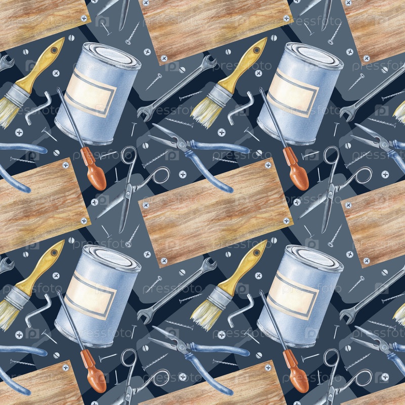 Бесшовный рисунок с рабочими инструментами и деревянной доской на фоне полупрозрачных силуэтов. Акварельная иллюстрация мужских рабочих инструментов для ремонта дома на темном фоне. Реалистичный повторяющийся рисунок для дизайна упаковки, ремонтных и стро