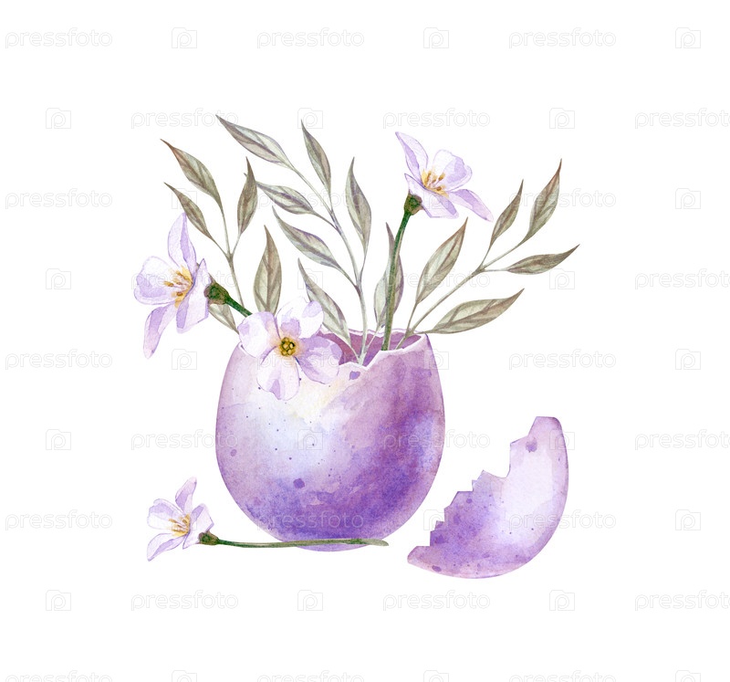 Акварельная иллюстрация небольшого букета белых цветов внутри яичной скорлупы.Реалистичное изображение пасхального украшения для дома.Клипарт для дизайна открыток, приглашений и весенних тем