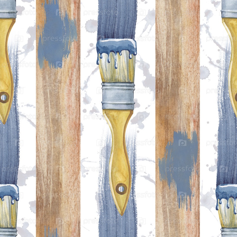 Бесшовный рисунок с деревянными досками, вертикальные мазки голубой краски с помощью кистей и пятен. Иллюстрация акварели с использованием рабочих инструментов на изолированном фоне. Реалистичный фон с элементами ремонта дома