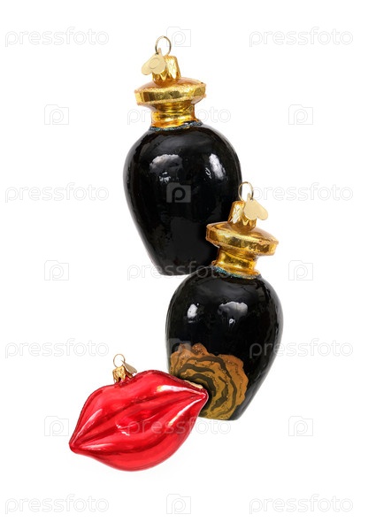 Рождественские игрушки в виде бутылки парфюма, изолированной на белом фоне