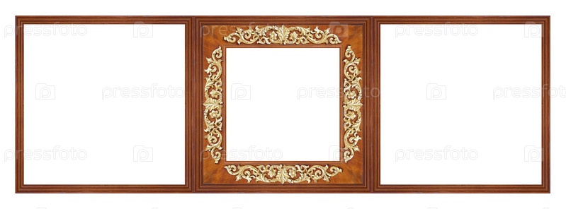Деревянная рама с золотым узором для картин, зеркал или изолированной фотографии на белом фоне