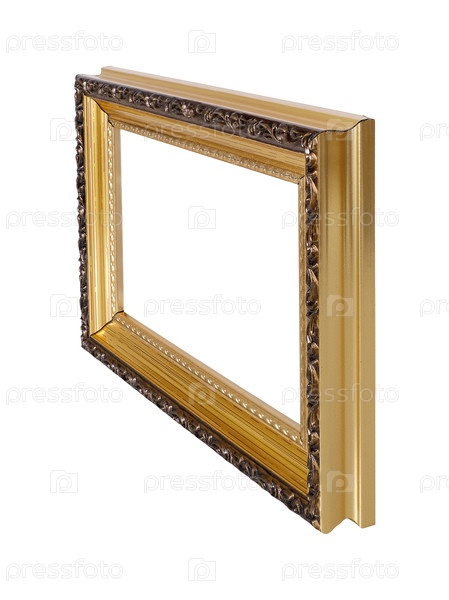 Золотая рама для картин, зеркал или фото в перспективе изолированного на белом фоне