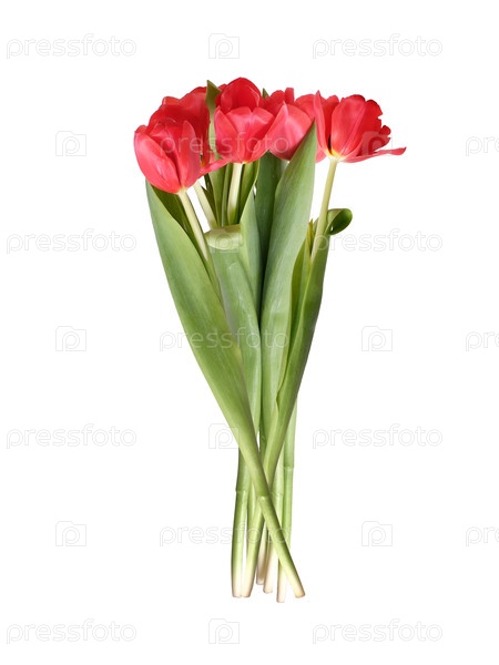 Яркие розовые тюльпаны с пышными зелеными листьями представлены изолированно на простом белом фоне