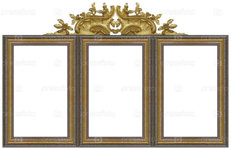 Тройная золотая рама (триптих) для картин, зеркал или фотографий, изолированных на белом фоне