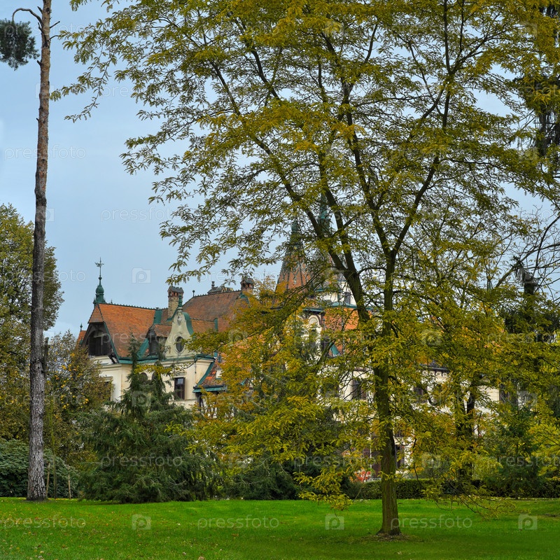 Осенний вид на замок Лесна (Zamek Lesna), романтическая архитектура 19 века, смешивающая неоготический, ренессансный и швейцарский стили, Чехия