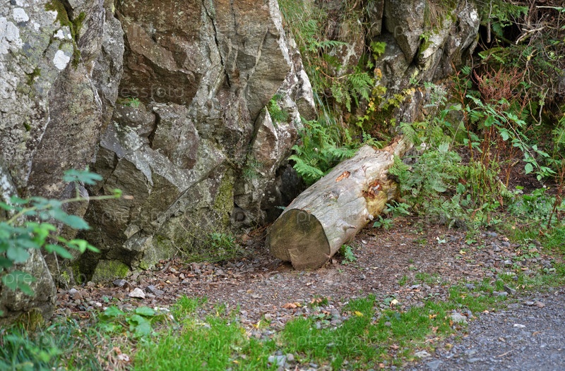 Лесной пейзаж с моховыми скалами и вырубленными бревнами в горных лесах