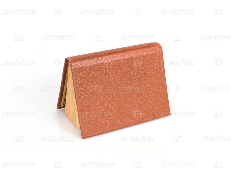 Книга в коричневой обложке с белыми листами, изолированными на белом фоне