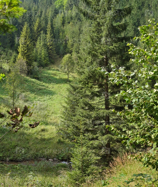 Летний лесный пейзаж с солнечными лугами и ручкой в Мала-Фатре, Словакия